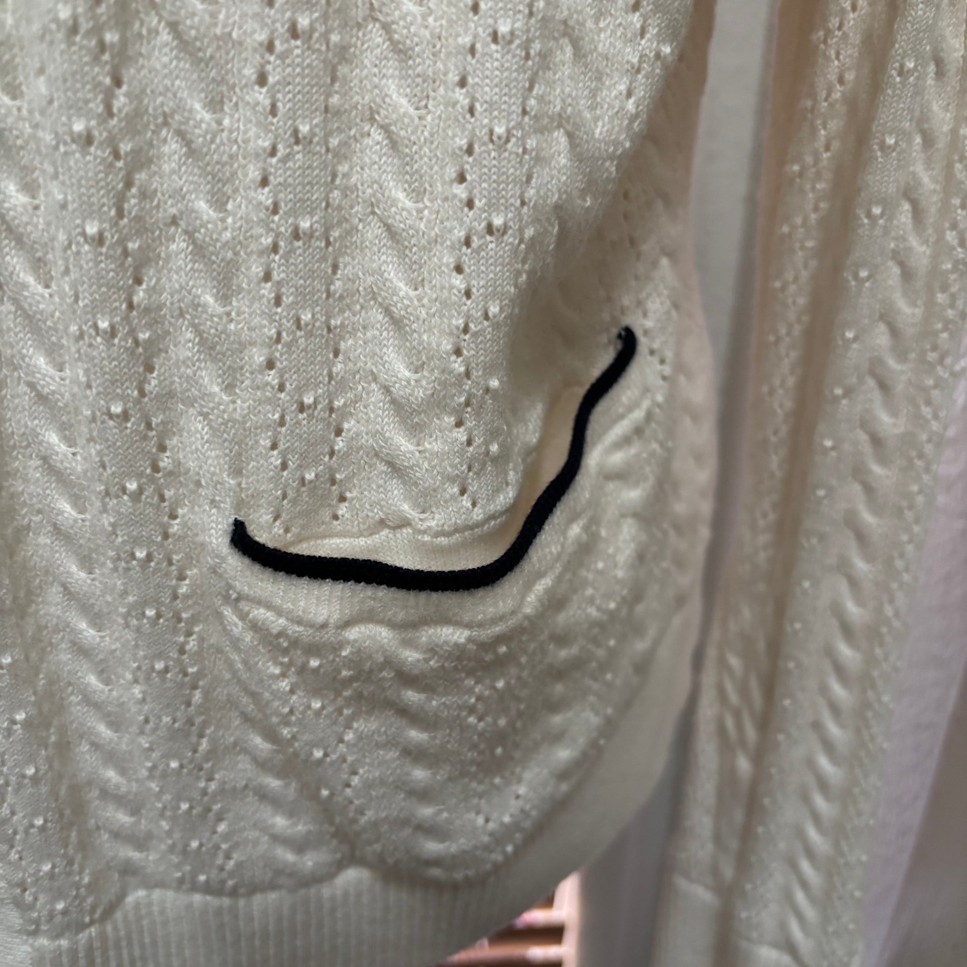 Elevate your wardrobe with this timeless two-piece knit set. Featuring a cream button-front cardigan with contrast black trim and a matching sleeveless shell top, it’s crafted in a soft cotton blend cable knit. Classic and versatile, this set blends sophistication with wearability, perfect for work, special occasions, or mixing and matching into endless styling options.