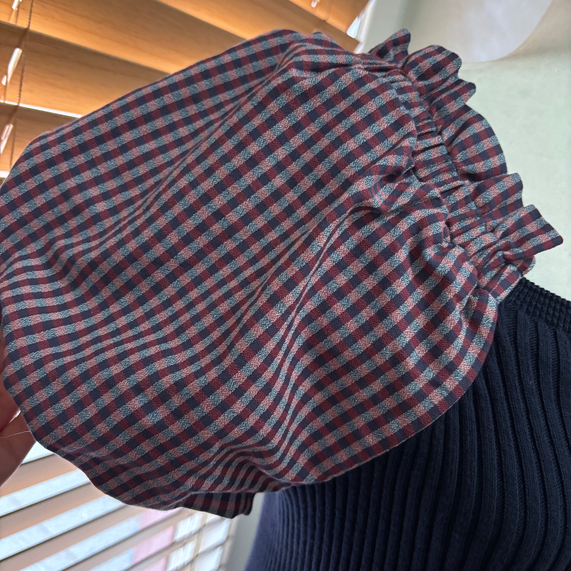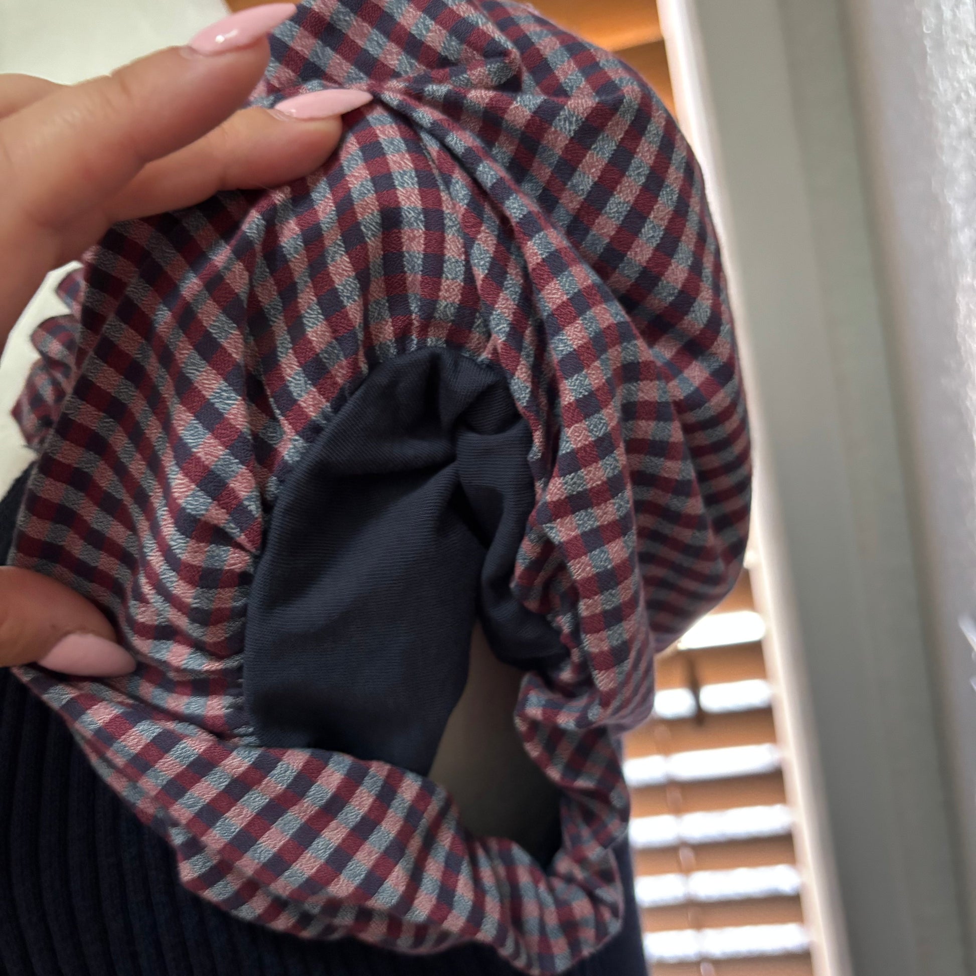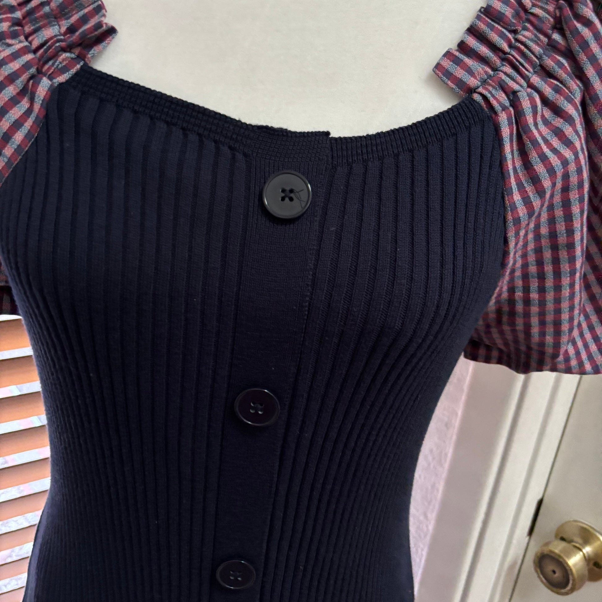 Details: Ribbed knit bodice, plaid puff sleeves, button accent, mini length