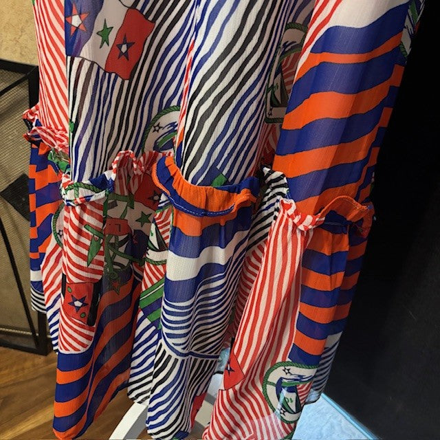 Stand out in luxury with this maxi-length designer dress, featuring bold nautical-inspired stripes in red, white, navy, and green. Sailing motifs and a ruffle hem add playful elegance, while the lightweight viscose blend fabric and adjustable spaghetti straps ensure comfort and versatility. Perfect for warm-weather outings, summer parties, or polished resort wear, this piece embodies Ralph Lauren’s signature sophistication with a vibrant twist.