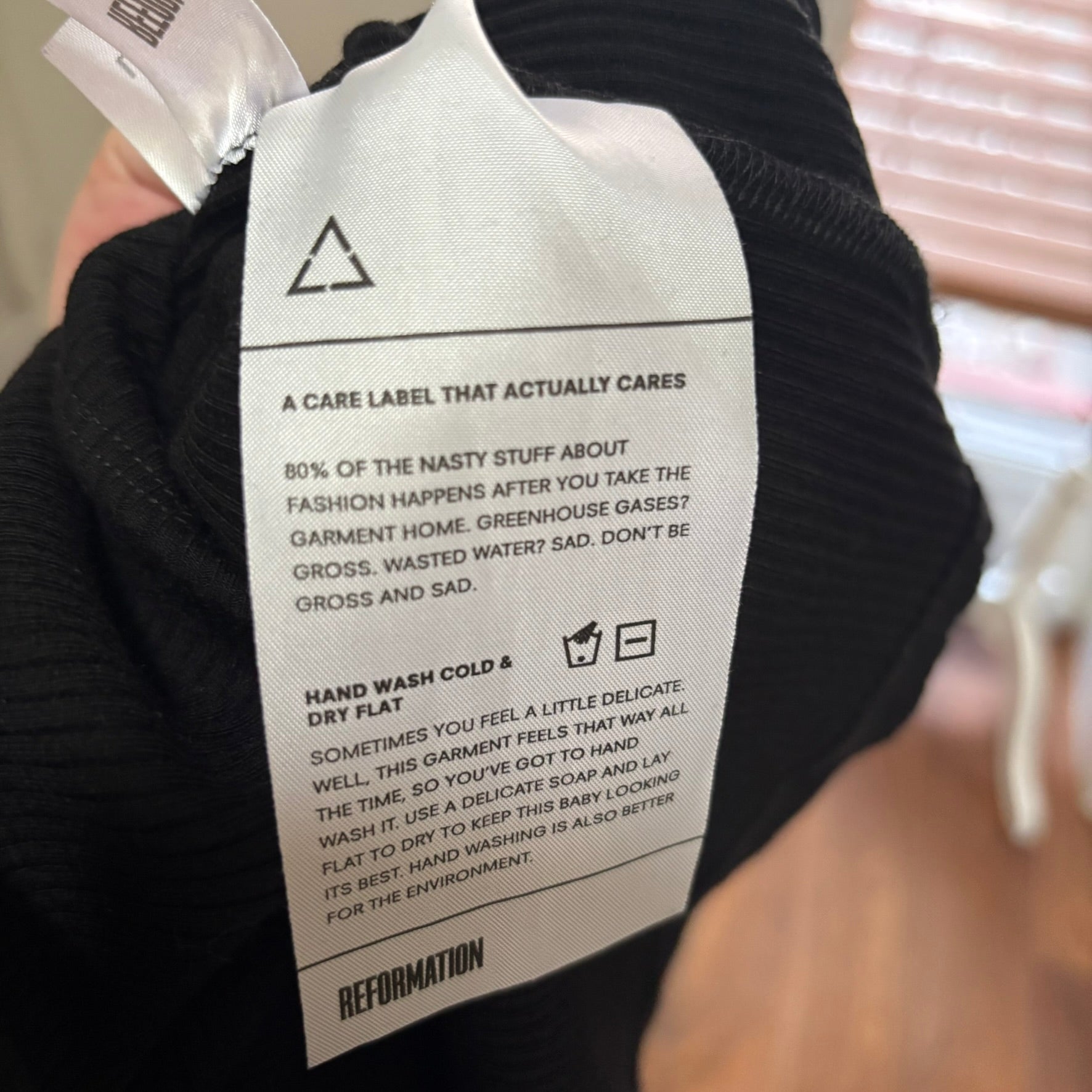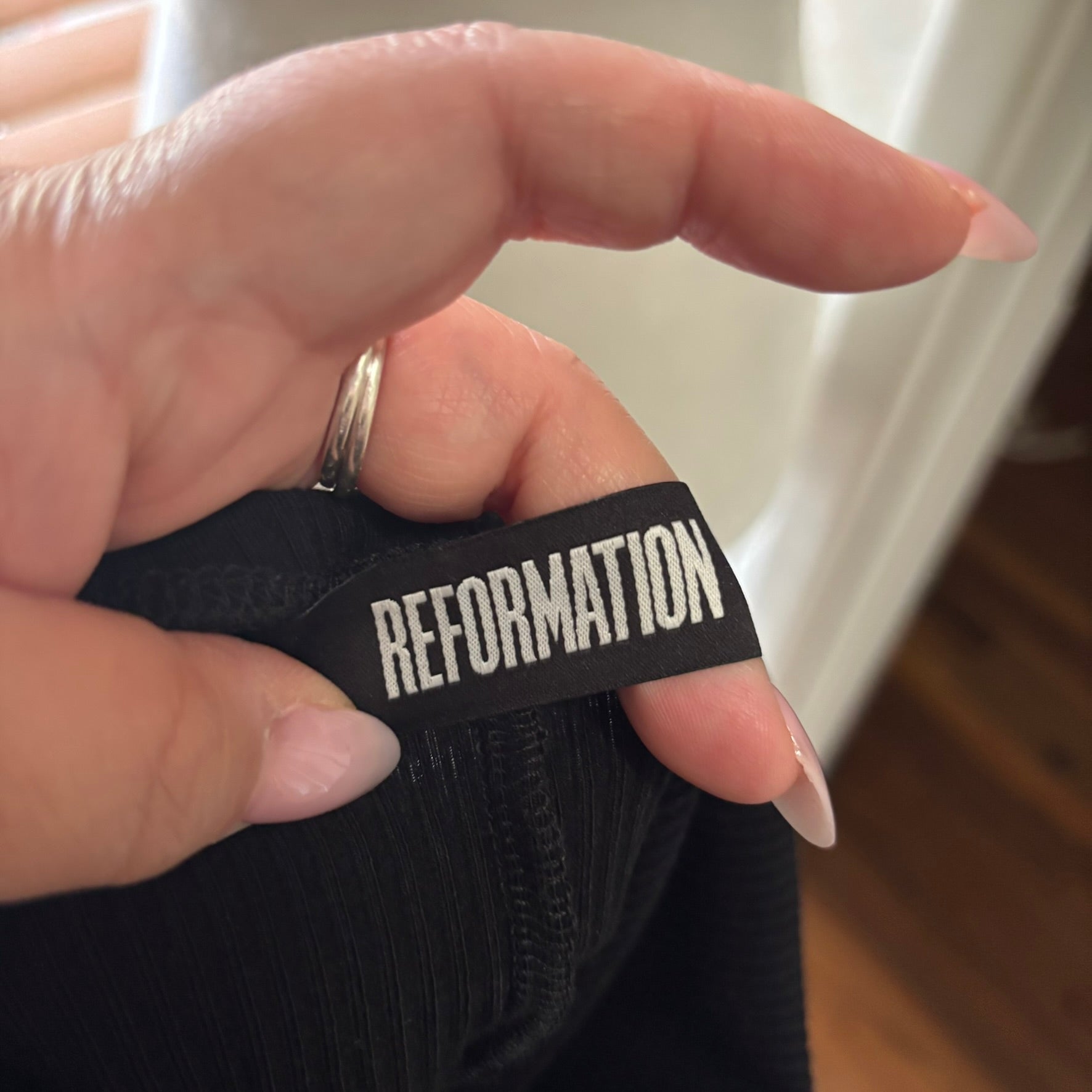 Classic meets modern with this Reformation black ribbed bodycon midi skirt. Designed with a flattering slim fit and subtle side slit, this versatile piece transitions seamlessly from day to night. Crafted in the USA from a sustainable Tencel® blend, it combines comfort, stretch, and eco-conscious style.