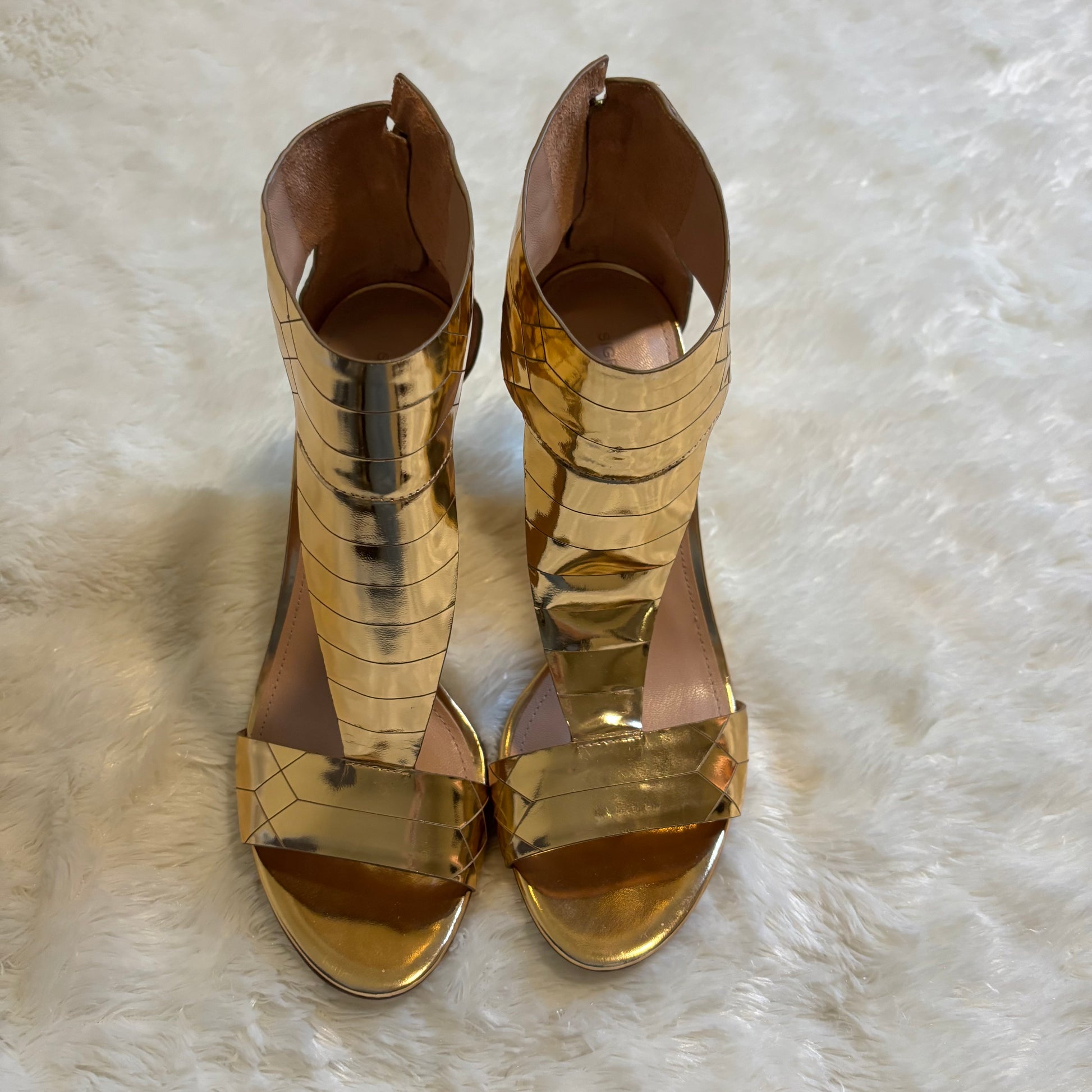 Sigerson Morrison Metallic Gold Wedge Sandals with Ankle Strap, Size 8